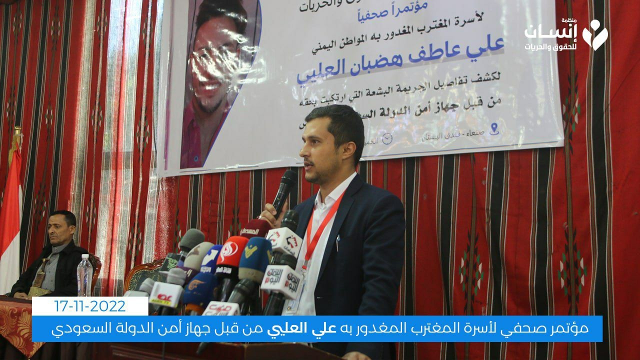 منظمة إنسان للحقوق والحريات تعقد مؤتمرا صحفيا لأسرة المغترب المغدور به علي عاطف هضبان العليي لكشف تفاصيل الجريمة التي ارتكبها بحقه جهاز أمن الدولة السعودي