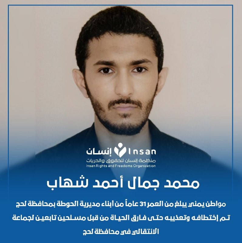 في إطار إهتمام منظمة إنسان للحقوق والحريات بقضايا المعتقلين والمختطفين تابعت المنظمة جريمة الإعتداء على حياة المواطن اليمني/ محمد جمال أحمد شهاب، البالغ من العمر ٣١عاماً، وهو أحد سكان مدينة الحوطة بمحافظة لحج، عقب اختطافه من مقر عمله واعتقاله وتعريضه للتعذيب الذي أفضى إلى إزهاق روحه داخل المعتقل في أحد السجون التابعة للمجلس الانتقالي بمحافظة لحج.