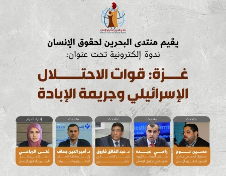 (بمشاركة منظمة إنسان للحقوق والحريات) *نظّم منتدى البحرين لحقوق الإنسان ندوة إلكترونية* (غزة: قوات الاحتلال الإسرائيلي وجريمة الإبادة)