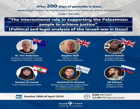 After 200 days of genocide in Gaza, Insan Organization for Rights and Freedoms holds an online symposium under the title. “The international role in supporting the Palestinian people to achieve justice” (Political and legal analysis of the Israeli war in