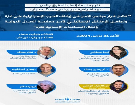 Insan Organization for Rights and Freedoms holds a symposium under the title “The failure of the Security Council's resolution to halt the Israeli war on Gaza, and Israel's disregard for the International Court of Justice's order to allow humanitarian aid