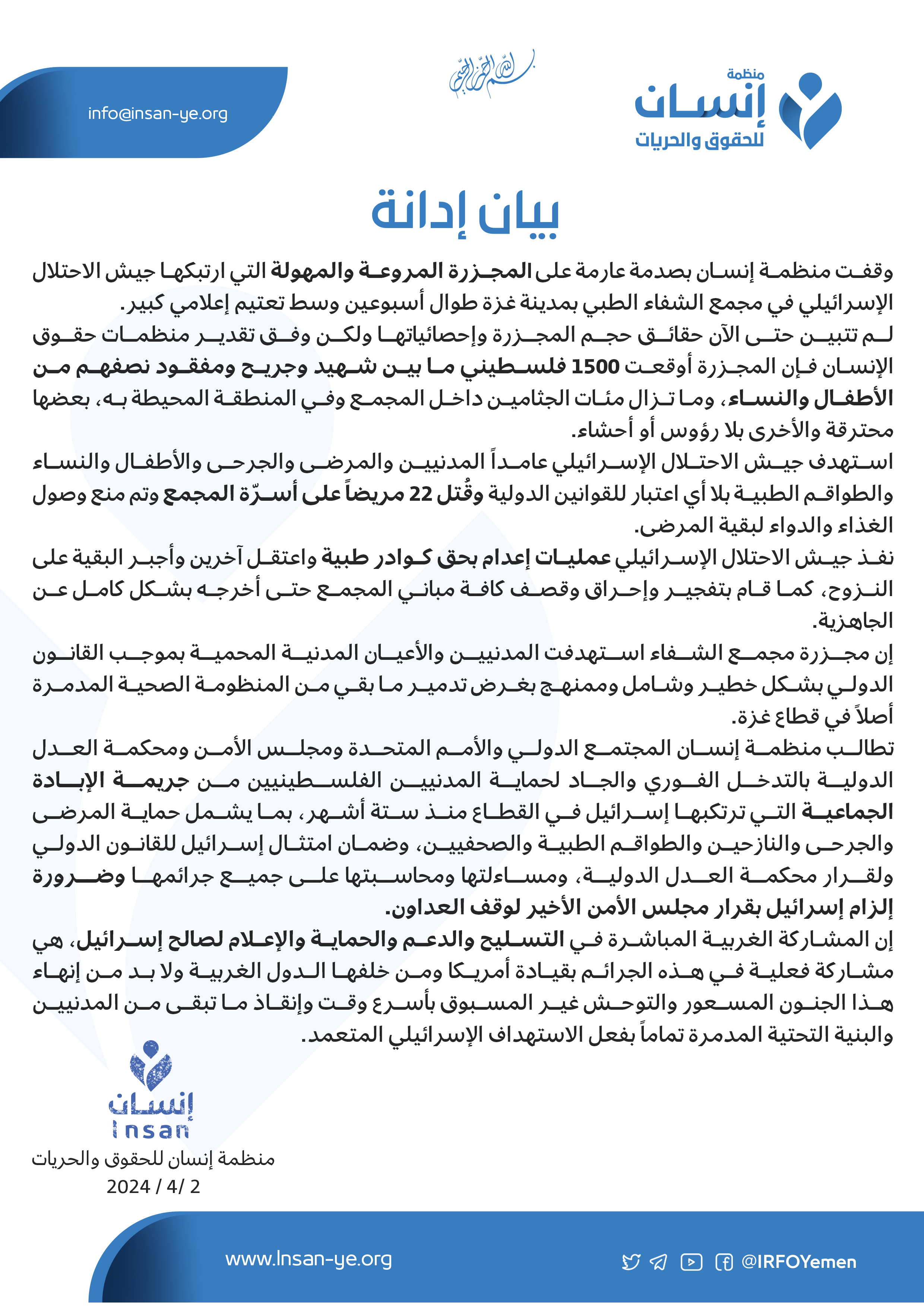 وقفت منظمة إنسان بصدمة عارمة على المجزرة المروعة والمهولة التي ارتبكها جيش الاحتلال الإسرائيلي في مجمع الشفاء الطبي بمدينة غزة طوال أسبوعين وسط تعتيم إعلامي كبير.