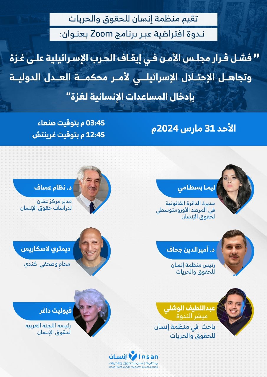 أقامت منظمة إنسان للحقوق والحريات الأحد ٣١ مارس ندوة افتراضية عبر برنامج Zoom بعنوان: "فشل قرار مجلس الأمن في إيقاف الحرب الإسرائيلية على غزة وتجاهل الإحتلال الإسرائيلي لأمر محكمة العدل الدولية بإدخال المساعدات الإنسانية لغزة "
