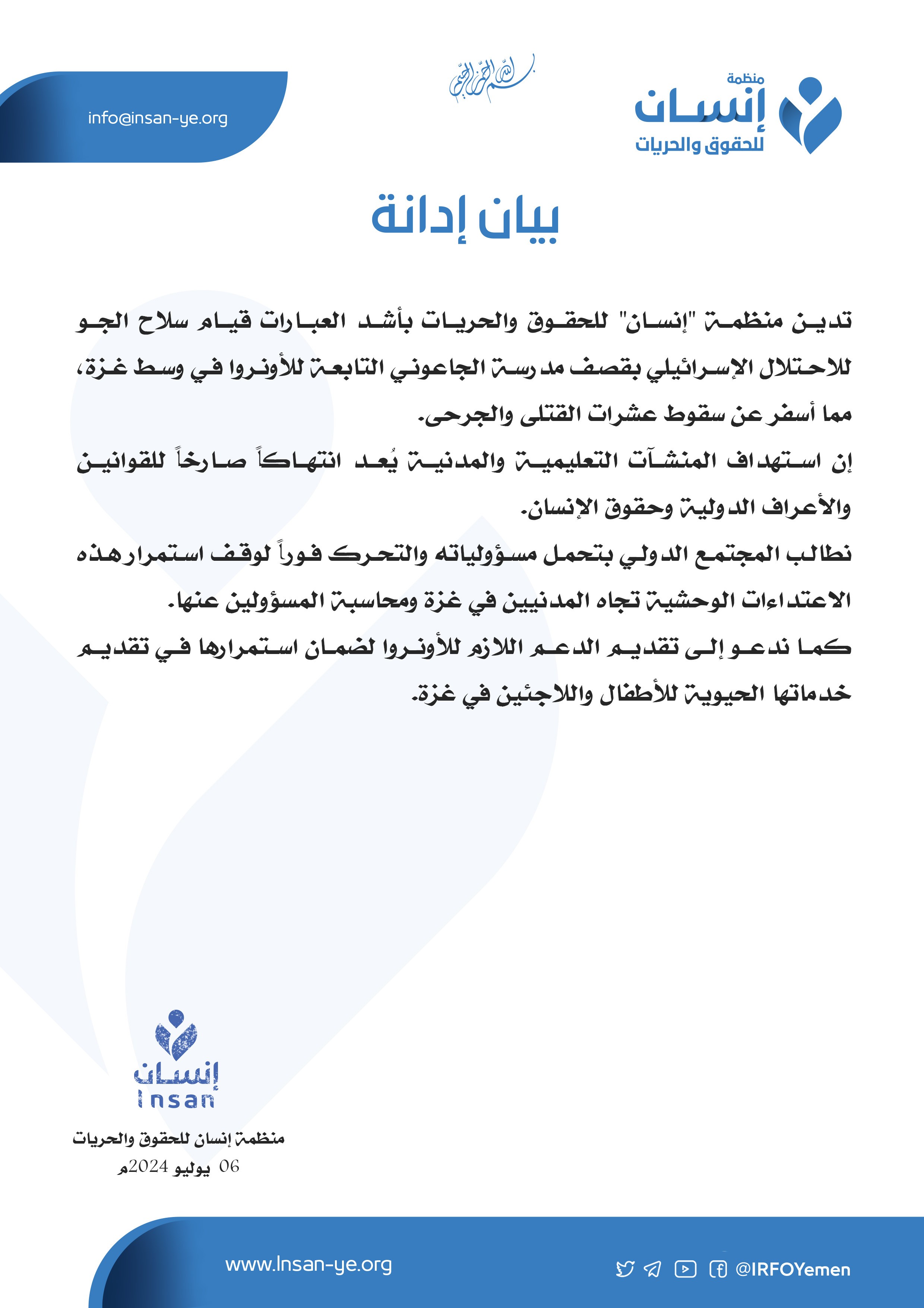 والحريات بأشد العبارات قيام سلاح الجو للاحتلال الإسرائيلي بقصف مدرسة الجاعوني