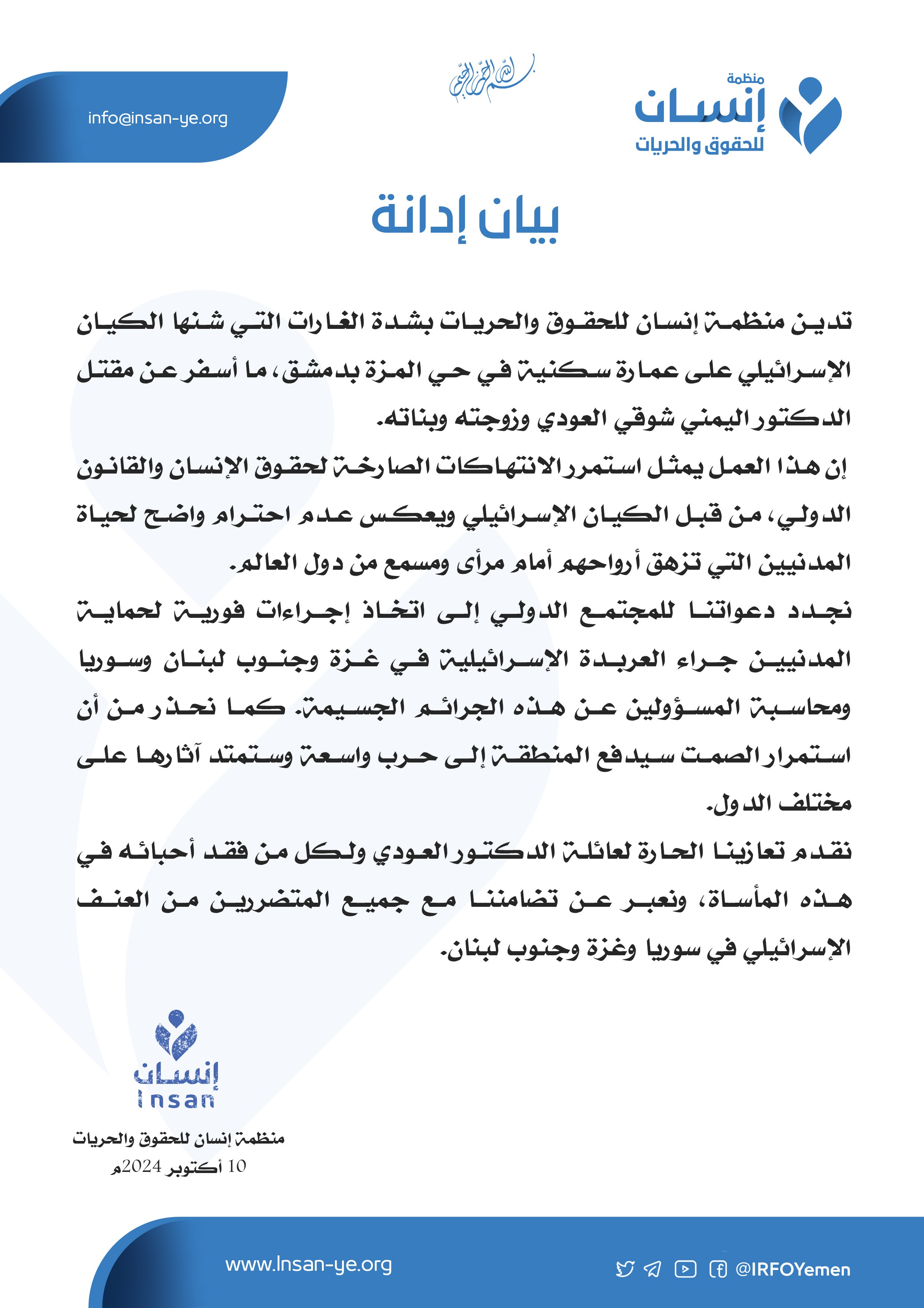 تدين منظمة إنسان للحقوق والحريات بشدة الغارات التي شنها الكيان الإسرائيلي على عمارة سكنية في حي المزة بدمشق، ما أسفر عن مقتل الدكتور اليمني شوقي العودي وزوجته وبناته.