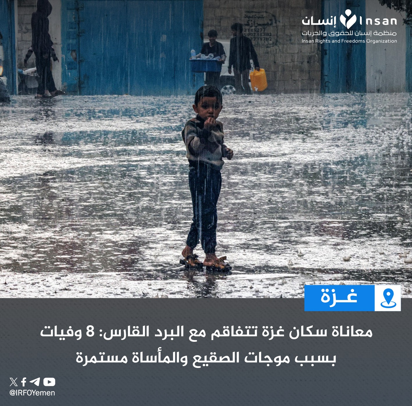 تزداد الأوضاع الإنسانية صعوبة في قطاع غزة، وأعلن المكتب الإعلامي الحكومي في بيان ارتفاع عدد الوفيات بسبب البرد القارس وموجات الصقيع إلى 8 وفيات بين النازحين الذين دُمرت منازلهم بفعل العدوان الإسرائيلي، مشيراً إلى أن العدد مُرشح للزيادة في ظل استمرار الظروف المأساوية التي يعيشها النازحون في خيام لا توفر الحد الأدنى من الحماية.