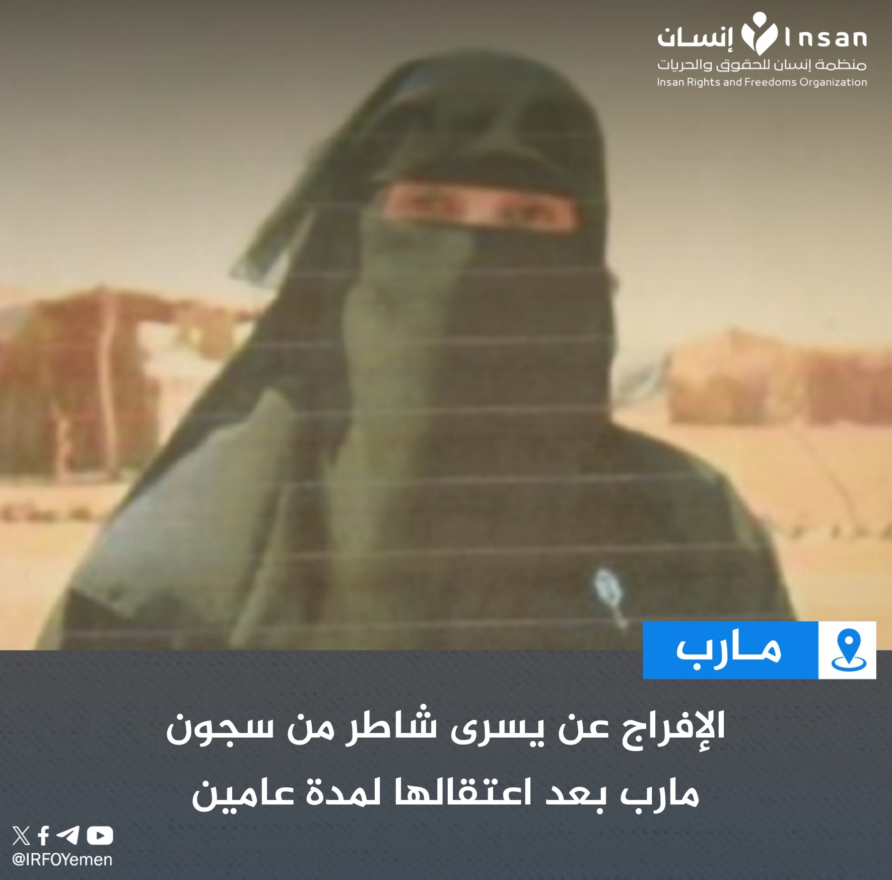 أفادت مصادر إعلامية متطابقة، بأنه تم الإفراج عن المواطنة يسرى شاطر، المحتجزة في سجون الأمن السياسي بمحافظة مارب منذ سبتمبر 2022.