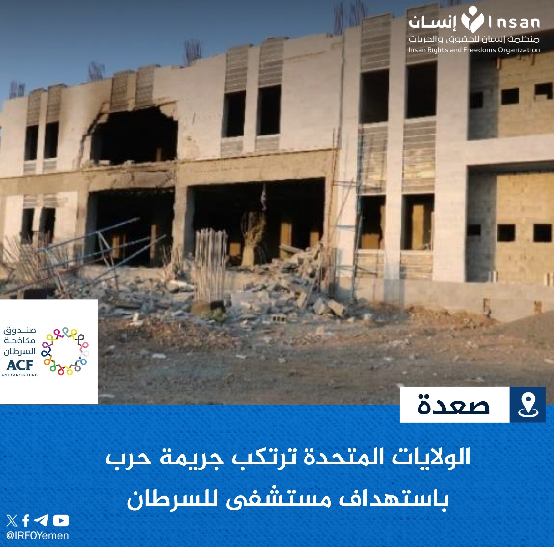 أكد صندوق مكافحة السرطان إقدام العدوان الأمريكي على استهداف مبنى مستشفى الرسول الأعظم لمرضى السرطان في محافظة صعدة، الذي كان قد وصل العمل فيه إلى مراحله الأخيرة ليصبح منشأة طبية حيوية ومرجعاً علاجياً لمرضى السرطان في صعدة والمحافظات المجاورة.