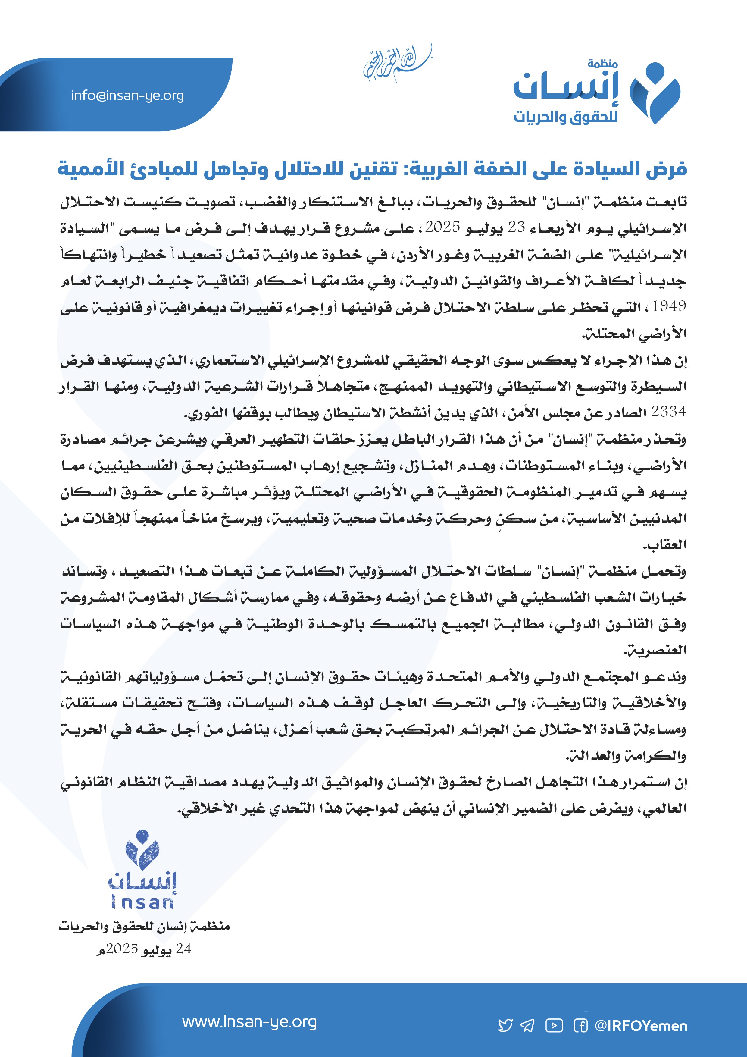 تابعت منظمة "إنسان" للحقوق والحريات، ببالغ الاستنكار والغضب، تصويت كنيست الاحتلال الإسرائيلي يوم الأربعاء 23 يوليو 2025، على مشروع قرار يهدف إلى فرض ما يسمى "السيادة الإسرائيلية" على الضفة الغربية وغور الأردن، في خطوة عدوانية تمثل تصعيداً خطيراً وانتهاكاً جديداً لكافة الأعراف والقوانين الدولية، وفي مقدمتها أحكام اتفاقية جنيف الرابعة لعام 1949، التي تحظر على سلطة الاحتلال فرض قوانينها أو إجراء تغييرات ديمغرافية أو قانونية على الأراضي المحتلة.