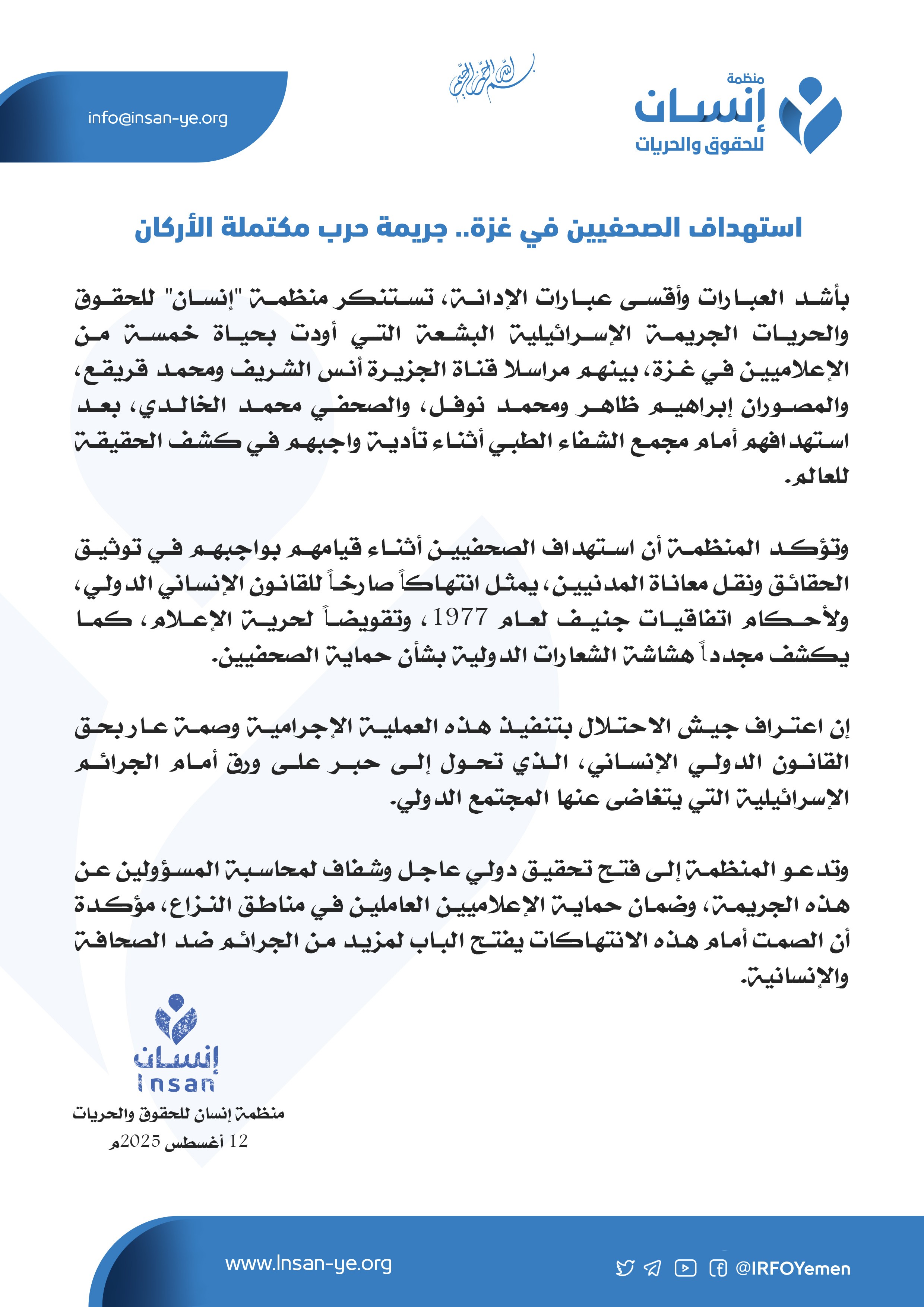 بأشد العبارات وأقسى عبارات الإدانة، تستنكر منظمة "إنسان" للحقوق والحريات الجريمة الإسرائيلية البشعة التي أودت بحياة خمسة من الإعلاميين في غزة، بينهم مراسلا قناة الجزيرة أنس الشريف ومحمد قريقع، والمصوران إبراهيم ظاهر ومحمد نوفل، والصحفي محمد الخالدي، بعد استهدافهم أمام مجمع الشفاء الطبي أثناء تأدية واجبهم في كشف الحقيقة للعالم.