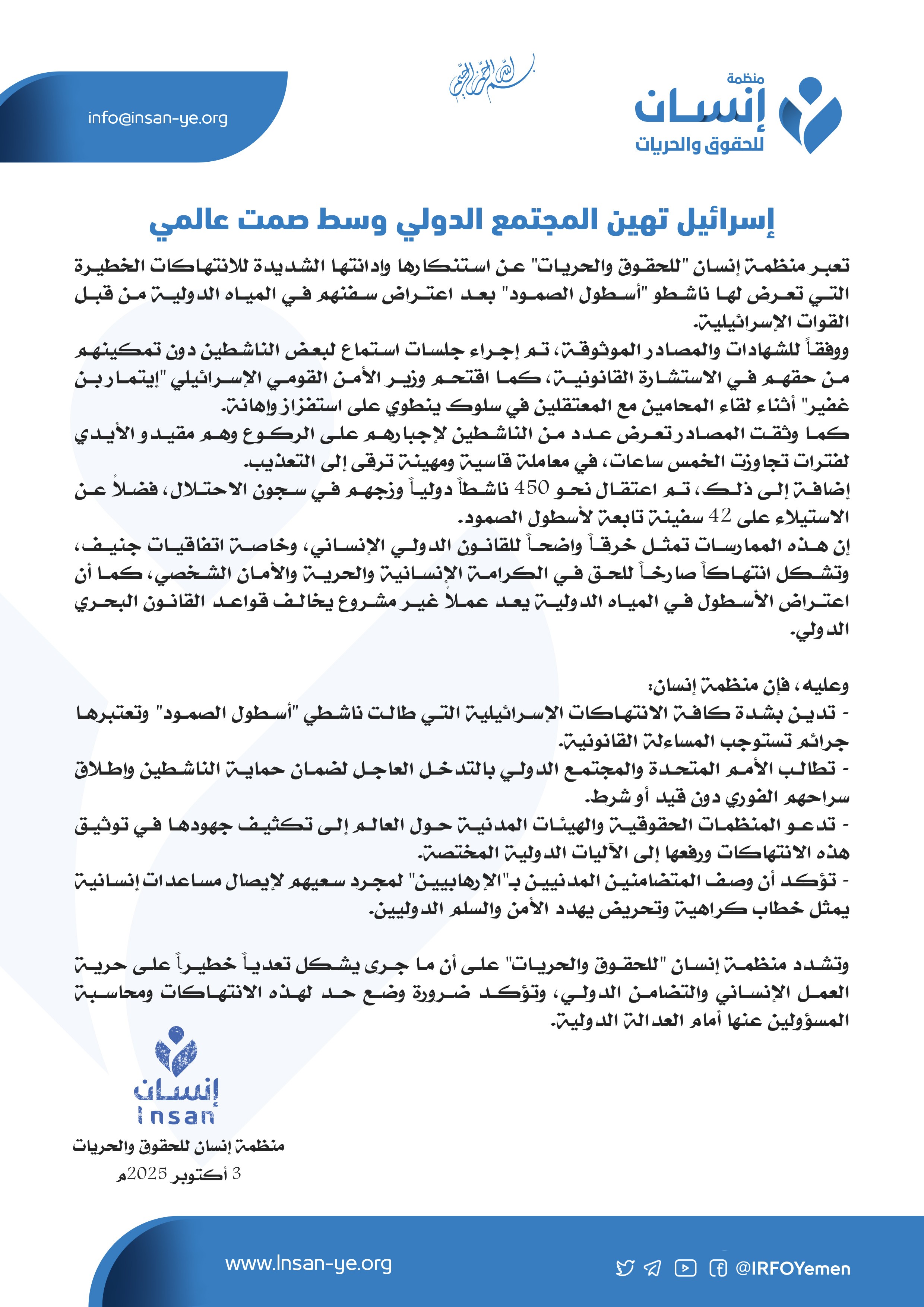 وتشدد منظمة إنسان "للحقوق والحريات" على أن ما جرى يشكل تعدياً خطيراً على حرية العمل الإنساني والتضامن الدولي، وتؤكد ضرورة وضع حد لهذه الانتهاكات ومحاسبة المسؤولين عنها أمام العدالة الدولية.