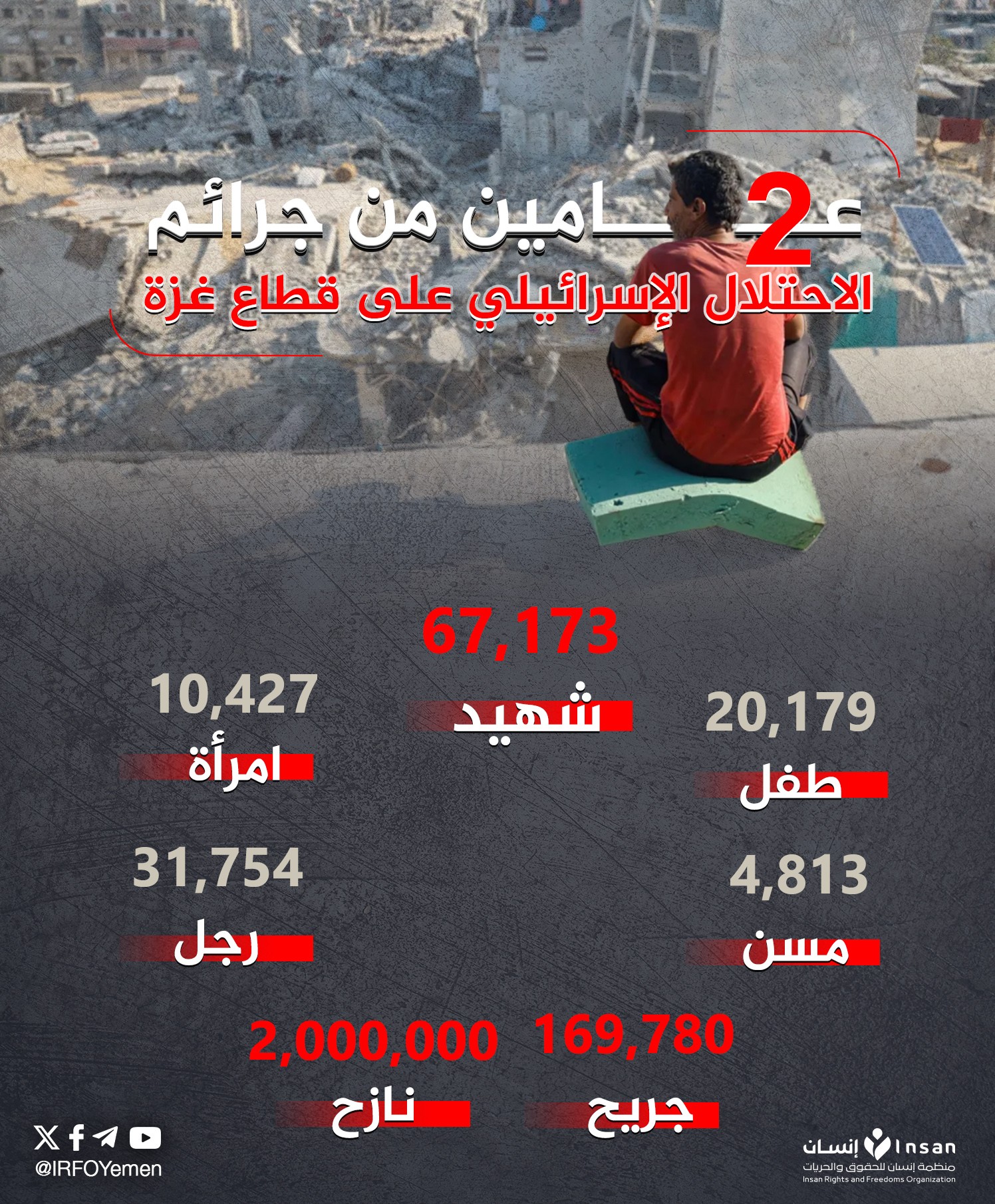 العدوان الهمجي تسبب في استشهاد 67,173 فلسطينياً، بينهم 20,179 طفلاً و10,427 امرأة و4,813 مسناً، إضافة إلى 31,754 رجلاً.