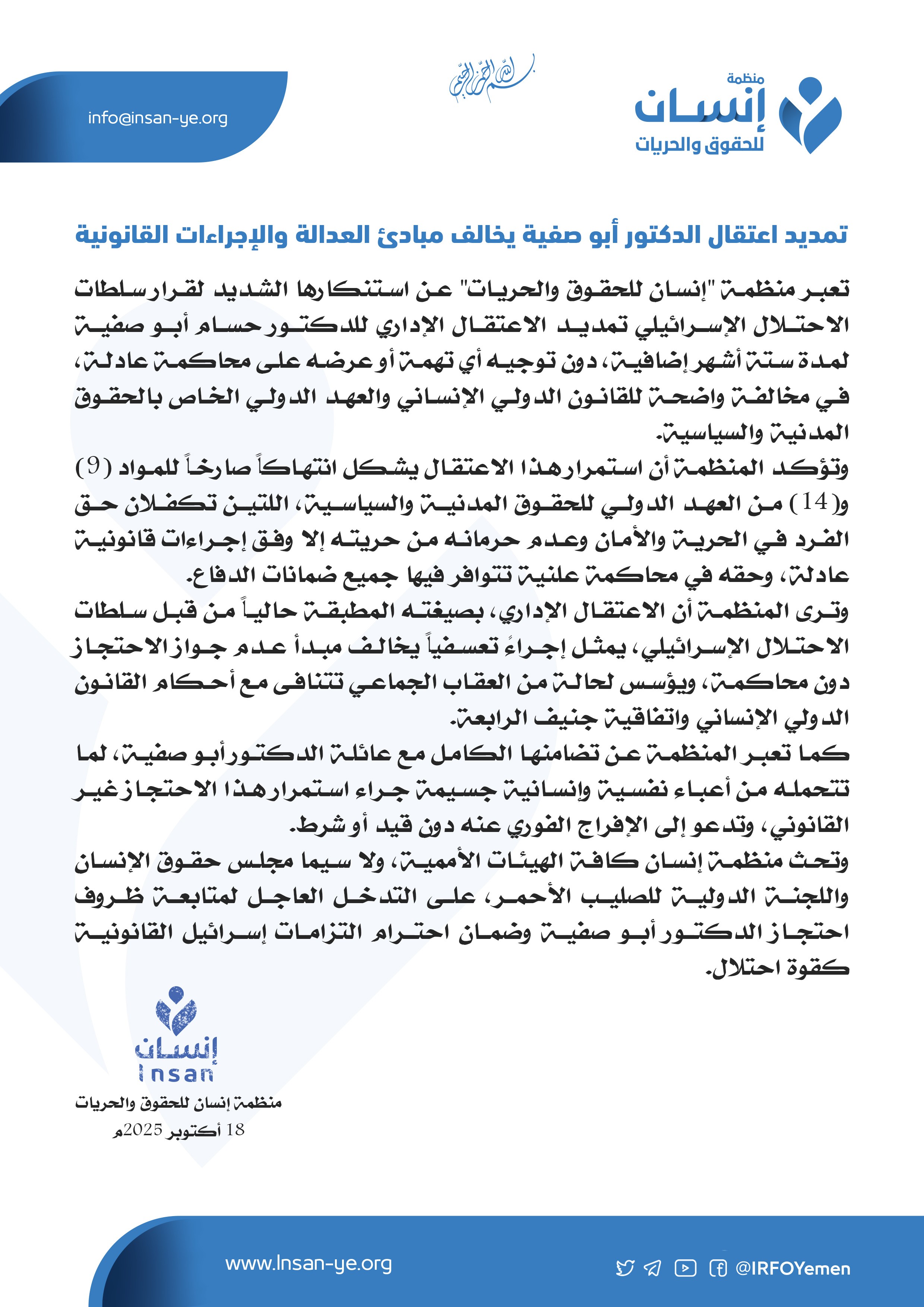 تعبر منظمة "إنسان للحقوق والحريات" عن استنكارها الشديد لقرار سلطات الاحتلال الإسرائيلي تمديد الاعتقال الإداري للدكتور حسام أبو صفية لمدة ستة أشهر إضافية، دون توجيه أي تهمة أو عرضه على محاكمة عادلة، في مخالفة واضحة للقانون الدولي الإنساني والعهد الدولي الخاص بالحقوق المدنية والسياسية.