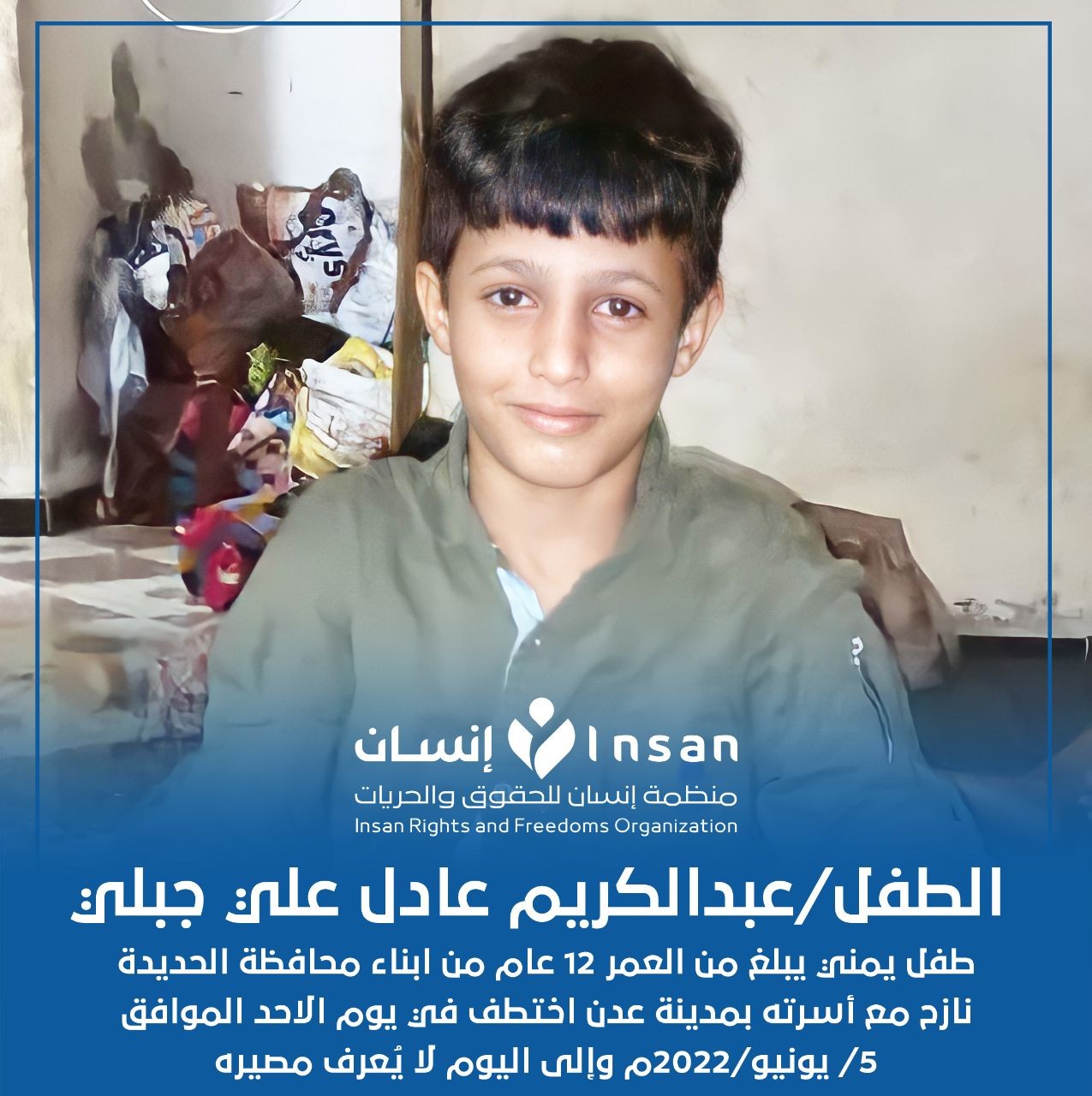 تلقت منظمة إنسان للحقوق والحريات بلاغ من اسرة الطفل المختطف/ عبدالكريم عادل علي جبلي، البالغ من العمر ١٢ عام.