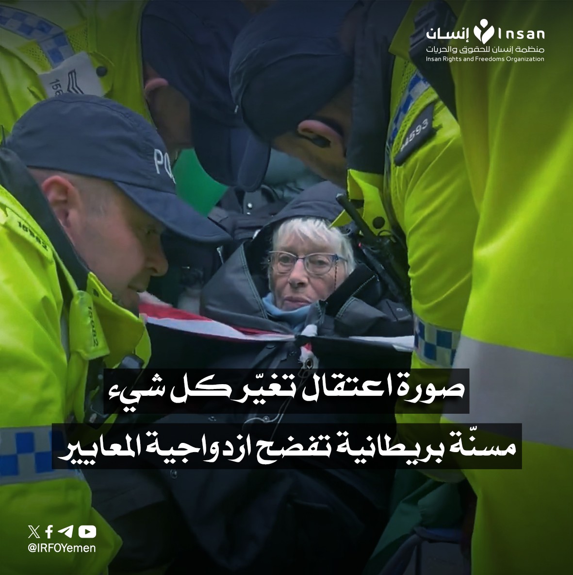 أوقفتها الشرطة البريطانية بموجب المادة 13 من قانون الإرهاب، بعد أن صنفت الحكومة البريطانية منظمة Palestine Action كمنظمة إرهابية في يوليو الماضي.
