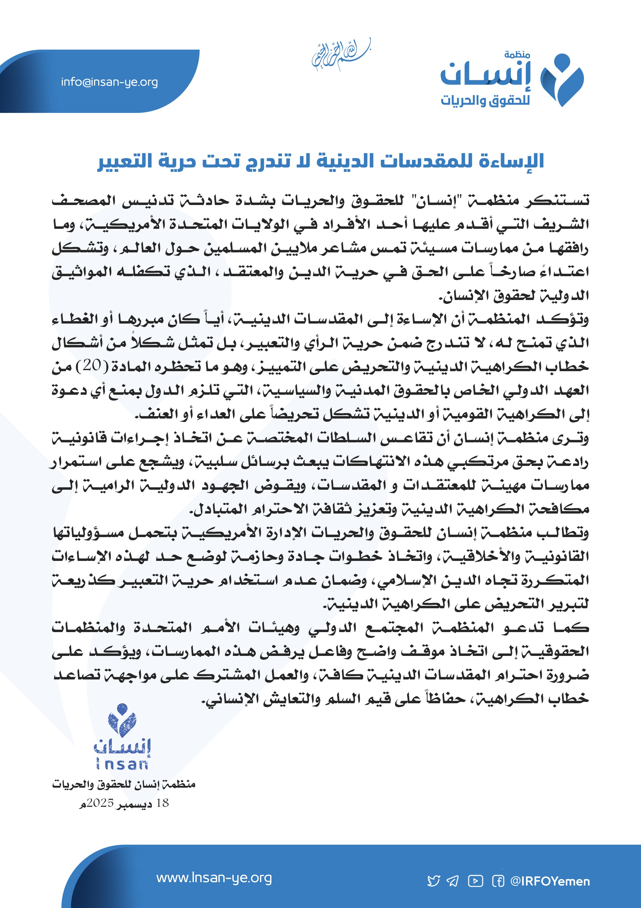 وتطالب منظمة إنسان للحقوق والحريات الإدارة الأمريكية بتحمل مسؤولياتها القانونية والأخلاقية، واتخاذ خطوات جادة وحازمة لوضع حد لهذه الإساءات المتكررة تجاه الدين الإسلامي، وضمان عدم استخدام حرية التعبير كذريعة لتبرير التحريض على الكراهية الدينية.