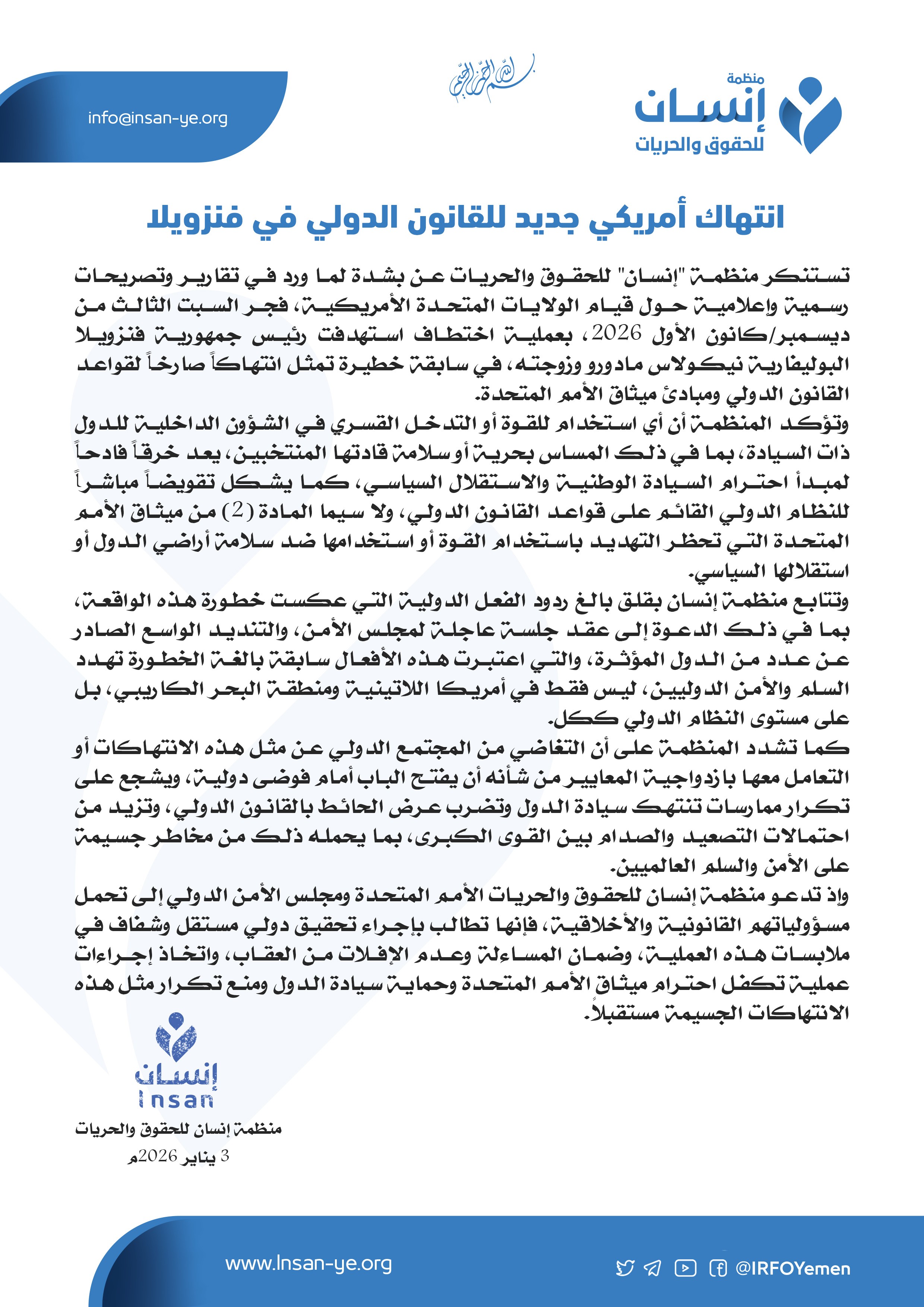 تستنكر منظمة "إنسان" للحقوق والحريات عن بشدة لما ورد في تقارير وتصريحات رسمية وإعلامية حول قيام الولايات المتحدة الأمريكية، فجر السبت الثالث من ديسمبر/كانون الأول 2026، بعملية اختطاف استهدفت رئيس جمهورية فنزويلا البوليفارية نيكولاس مادورو وزوجته، في سابقة خطيرة تمثل انتهاكاً صارخاً لقواعد القانون الدولي ومبادئ ميثاق الأمم المتحدة.