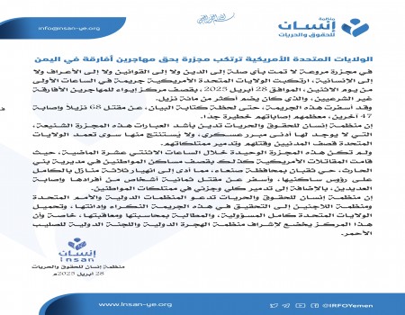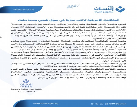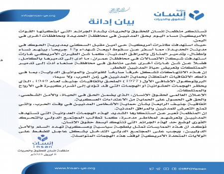 منظمة إنسان تدين جرائم العدوان الأمريكي في اليمن وتدعو لمحاسبة المسؤولين