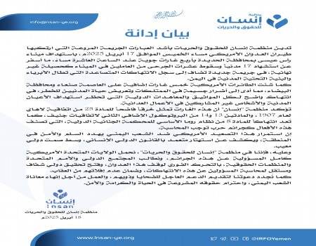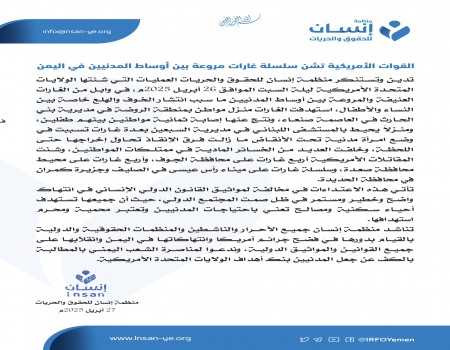منظمة "إنسان" تدين الغارات الأمريكية على الأحياء السكنية في صنعاء
