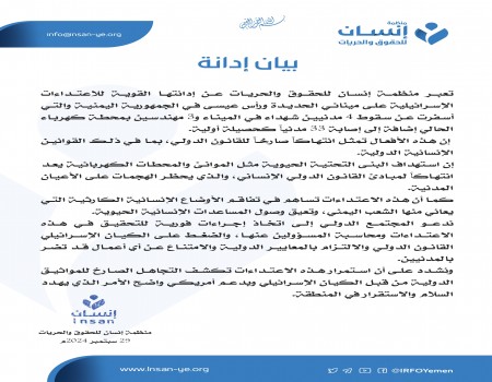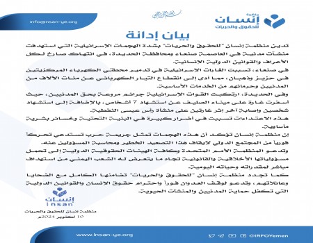 منظمة إنسان تدين الاعتداءات الإسرائيلية على صنعاء والحديدة واستهداف المنشآت المدنية
