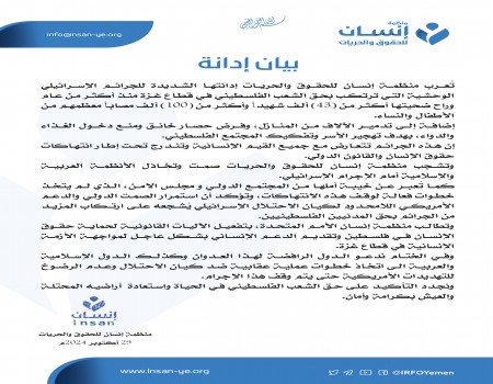 مع مرور أكثر من عام من العداون على غزة، منظمة إنسان تدين الجرائم الإسرائيلية بحق الفلسطينيين في غزة