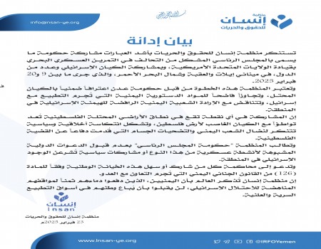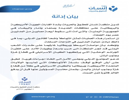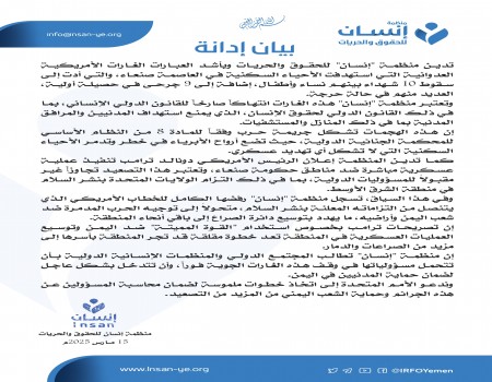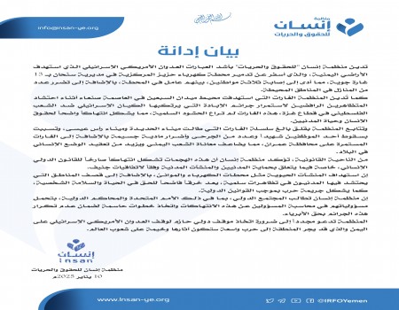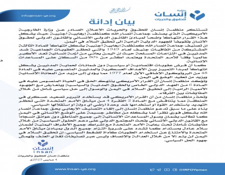 منظمة "إنسان" تستنكر إعلان واشنطن الحرب على صنعاء