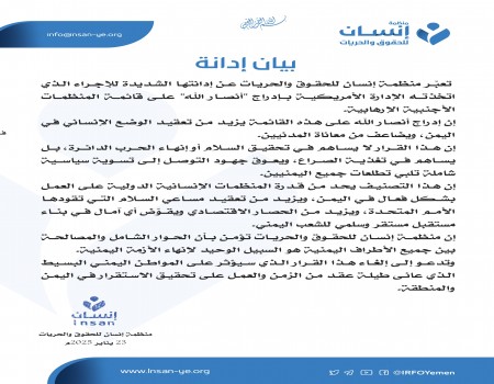 منظمة إنسان تدين تصنيف أنصار الله كمنظمة إرهابية وتدعو لإلغائه حفاظاً على السلام في اليمن
