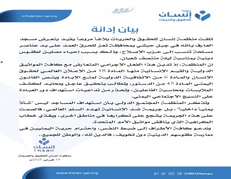منظمة إنسان حرق المساجد جريمة تنذر بتصاعد الكراهية الدينية