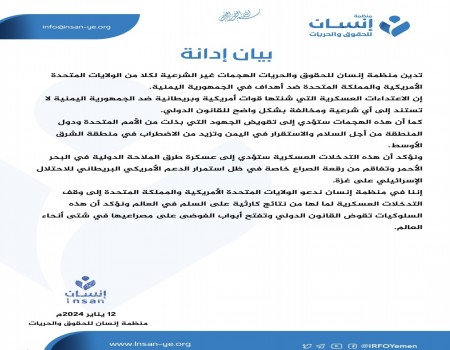 منظمة إنسان للحقوق والحريات تدين الهجمات غير الشرعية للولايات المتحدة والمملكة المتحدة على اليمن وتدعو إلى وقف التدخلات العسكرية