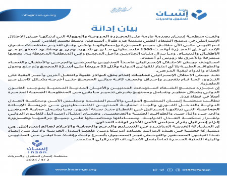 "مجزرة مروعة في مجمع الشفاء الطبي بغزة: منظمة إنسان تطالب بالتدخل العاجل لوقف الإبادة الجماعية في قطاع غزة"