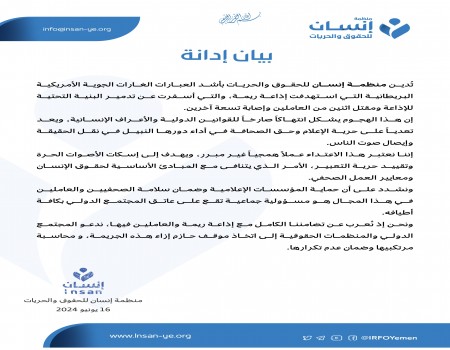 منظمة إنسان تستنكر استمرار القصف الجوي الأمريكي البريطاني على الإذاعات المحلية اليمنية