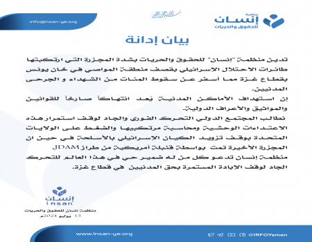 منظمة "إنسان" تدين المجزرة الإسرائيلية في خان يونس بقطاع غزة وتطالب بتحرك دولي فوري