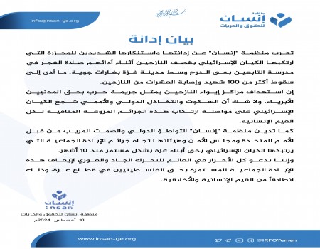 منظمة إنسان تستنكر المجزرة المروعة التي ارتكبها الكيان الإسرائيلي بحق النازحين في مدرسة التابعين وسط غزة